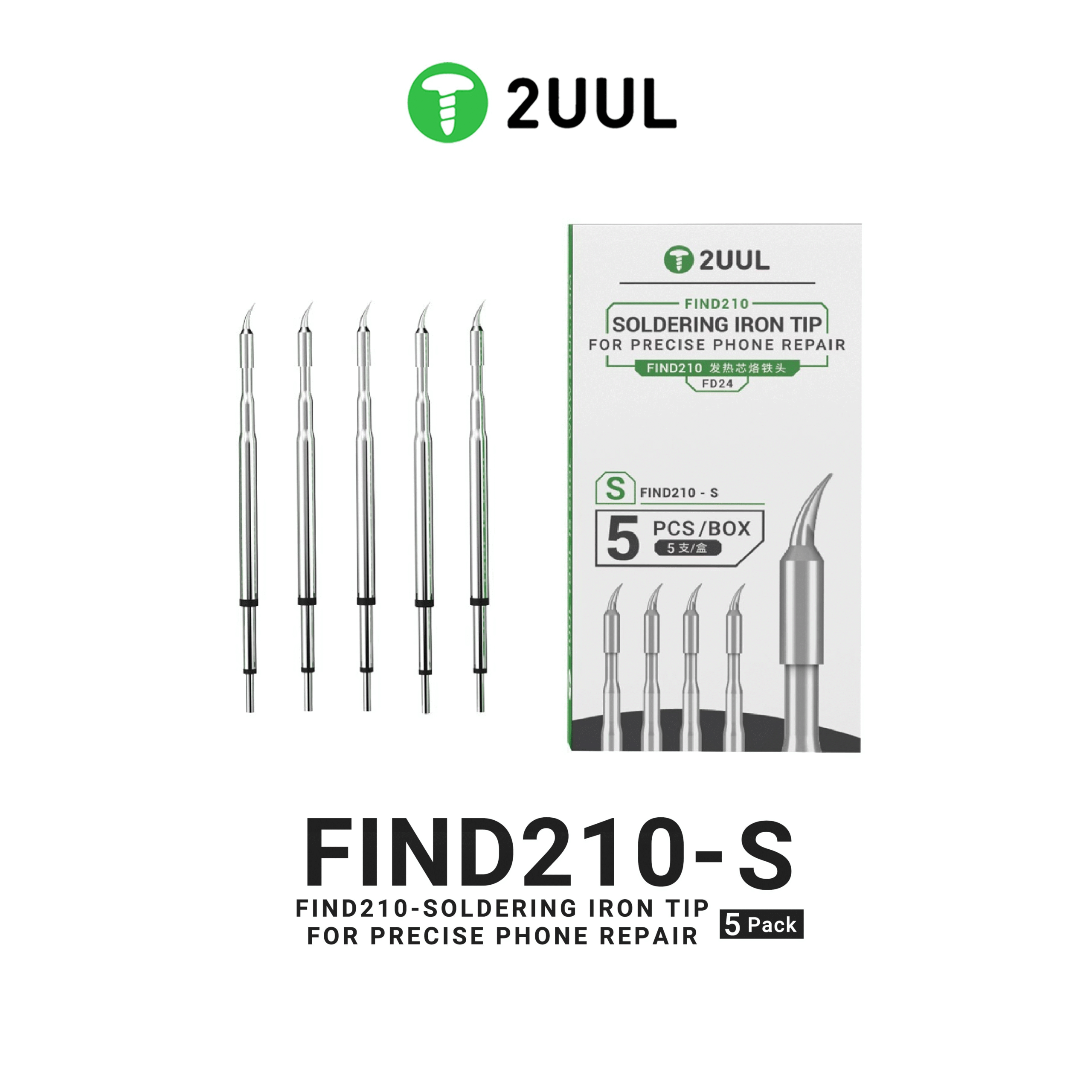 The 2UUL FD24 C210-S Soldering Iron Tip 5 Pack is an essential tool for anyone involved in high-precision soldering, offering reliability, accuracy, and versatility for a range of electronics and mobile repair applications.