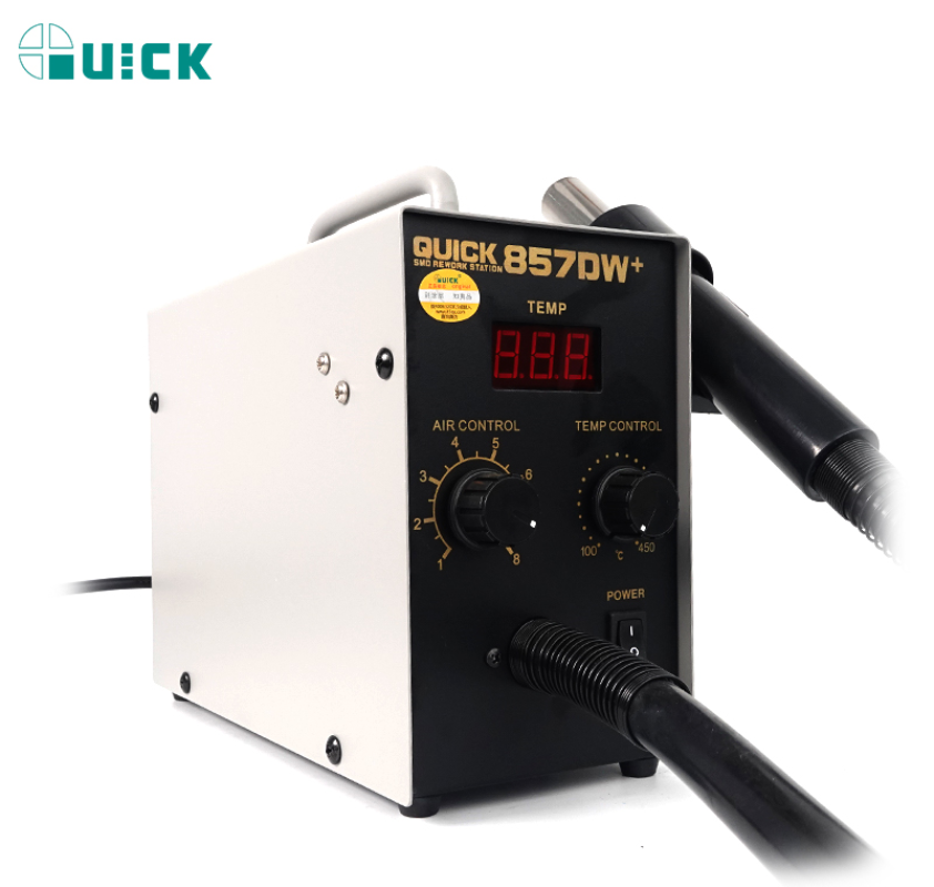 - Quick 857DW+ Lead-Free Adjustable SMD Rework Station 100% Original Easy to use. the airflow linear regulator, mains airflow can be kept stable when there is a change, the double vortex rotating wind, the wind gentle, there is no impact.