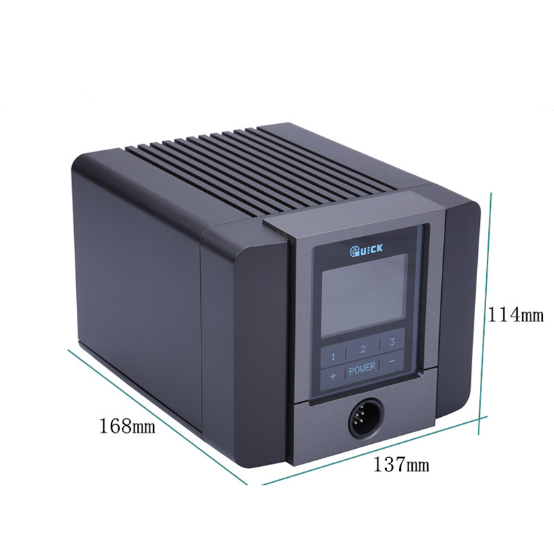 Advanced ESD Soldering station with 120 W heating power. Designed for professional soldering electronic components using lead-free solders. Improved, resistance-type heating principles guarantee the best heating parameters. This Quick soldering station has also a new design LCD and easy-to-use buttons to digitally set the parameters. Ideal for mobile phone circuit board repairing, mobile phone BGA desoldering repairing, etc. FAST heat up speed with auto sleep when not in use.\n\n