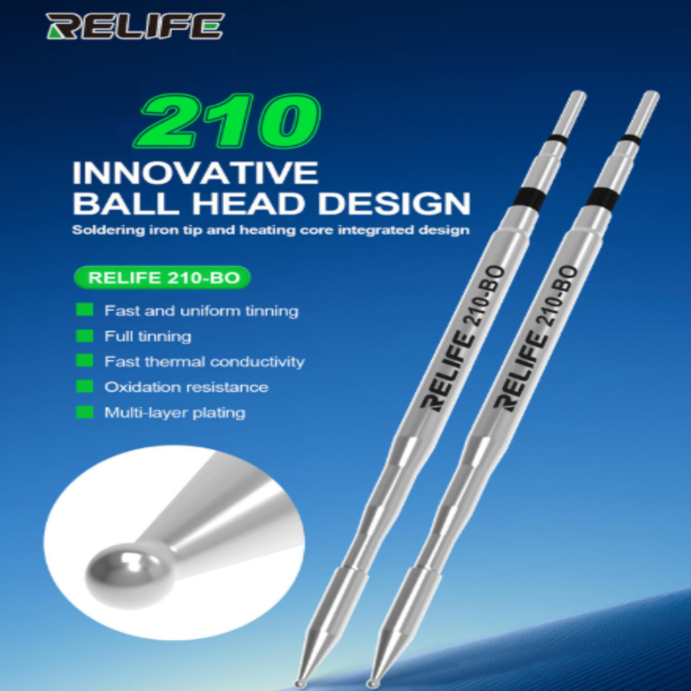 The Relife 210-BO is an advanced integrated soldering iron tip and heater featuring an innovative ball-tip design for superior heat transfer and precision. Specially developed for professional PCB and SMD soldering, it combines both the heater and tip into one compact unit, ensuring faster heating, stable temperature, and longer lifespan. The ergonomic design allows effortless operation, making it perfect for micro-soldering, rework, and repair of mobile motherboards and other electronic components.