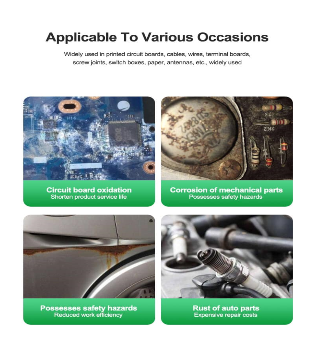 1. Widely used in printed circuit boards, cables, wires, terminal boards, screw joints, switch boxes, paper, antennas, etc., widely used.