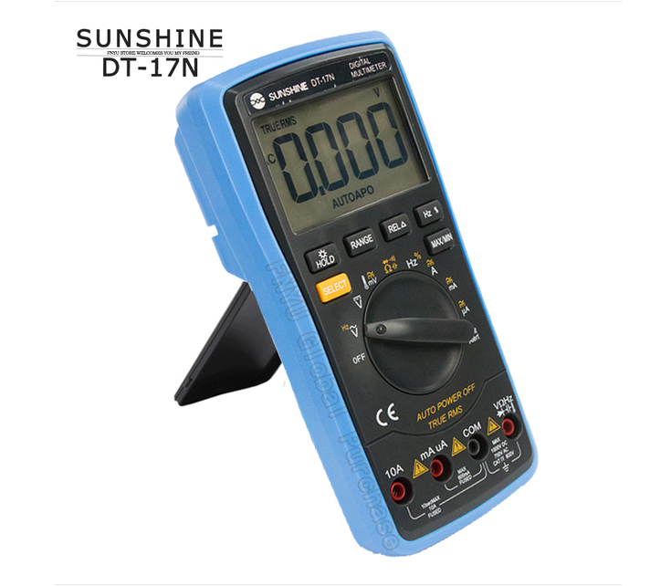 SUNSHINE DT 17N DIGITAL MULTIMETER ORIGINAL is a 35/6 automatic digital instrument with stable performance, high precision, and high reliability; with a battery-driven automatic digital multimeter, the instrument adopts a 21mm high LCD, and clear reading; About 15 seconds delay backlight, high-pressure alarm, and overload protection. It will be more convenient to use. This series of instruments can measure the DC voltage and AC voltage DC and AC resistance, Capacitance Diode, temperature, and on-off test. True RMS measurement, LED high-voltage output measurement, and frequency parameters a superior performance instruments and are an ideal tool for laboratory, factory, and Radio enthusiasts.